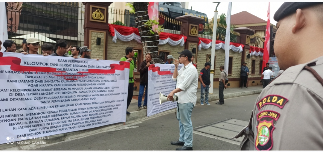 Jakarta, Puluhan anggota Kelompok Tani Berkat Bersama asal desa Tepian Langsat, kecamatan Bengalon, kabupaten Kutai Timur unjuk rasa ke kantor Mabes Polri dan kantor Kementerian ATR BPN,Senin (24/7/2023).