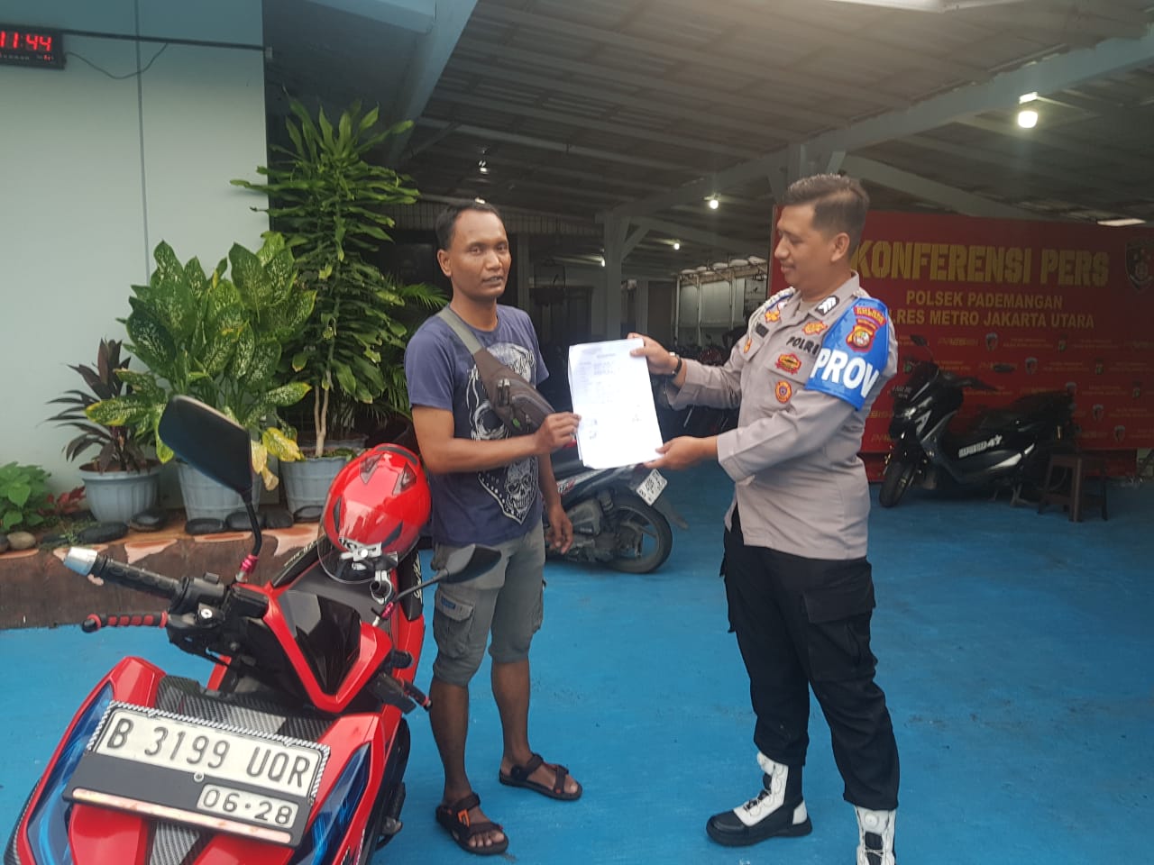 Petugas piket Provos Polsek Pademangan, Brigadir Kurniawan Dwi P, memfasilitasi penyerahan satu unit sepeda motor Honda Vario berwarna merah dengan nomor polisi B-3199-VQR kepada pemiliknya, Akhmad Sofyan Arifin.