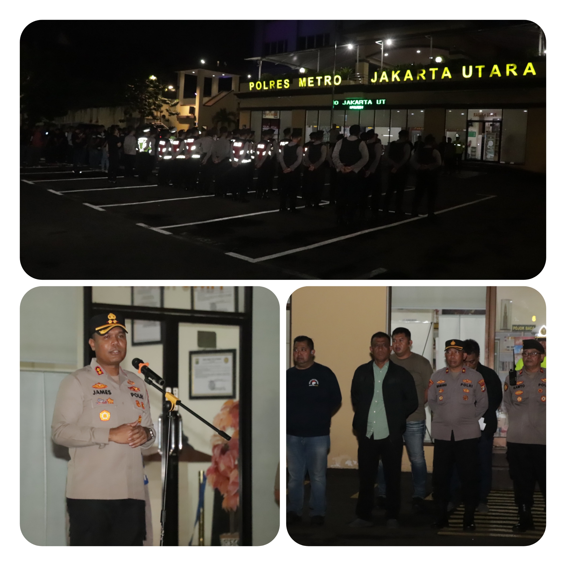 Apel yang berlangsung di halaman Mapolres Metro Jakarta Utara pada pukul 23.00 WIB tersebut dipimpin langsung oleh Wakapolres Metro Jakut, AKBP James H. Hutajulu, S.I.K., S.H., M.H., M.I.K., dengan melibatkan 83 personel gabungan lintas satuan, mulai dari Sat Samapta, Reskrim, Resnarkoba, Intelkam, hingga Dokkes dan Propam.
