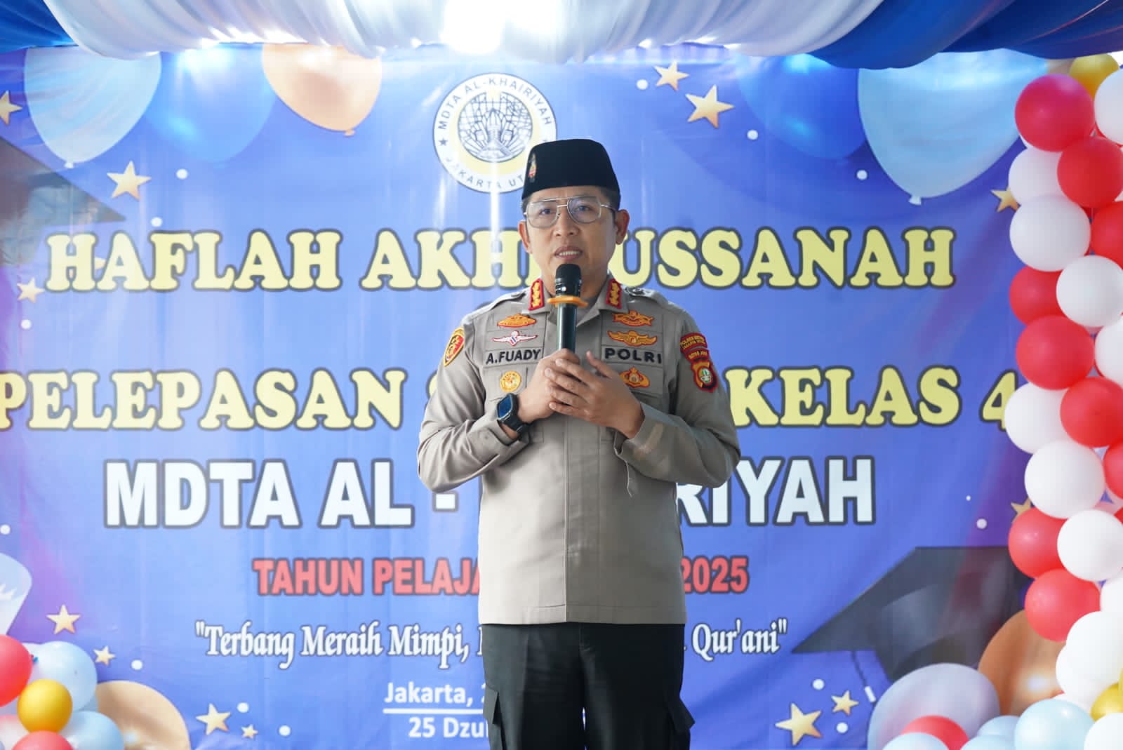 Jakarta Utara – Suasana haru dan penuh kehangatan menyelimuti acara Akhirussanah dan Wisuda Santri MDTA Al-Khairiyah yang berlangsung di Panti Asuhan Al-Khairiyah, Kelurahan Semper Barat, Kecamatan Cilincing, Jakarta Utara. Acara yang digelar sejak pukul 08.00 WIB tersebut dihadiri langsung oleh Kapolres Metro Jakarta Utara, Kombes Pol. H. Ahmad Fuady, S.H., S.I.K., M.H., yang juga merupakan alumni madrasah tersebut, Sabtu (21/6/2025).
