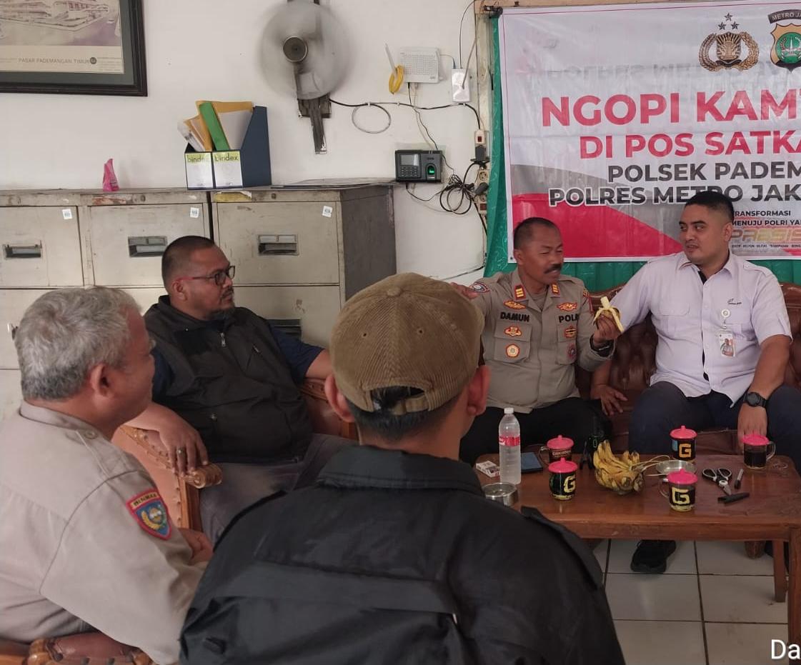 Jakarta Utara – Dalam upaya mempererat hubungan dengan masyarakat sekaligus menjaga keamanan lingkungan, Polsek Pademangan menggelar kegiatan Ngopi Kamtibmas di Kantor PD Pasar Jaya, Pasar Elang, Pademangan III, Kelurahan Pademangan Timur, Selasa (22/7/2025) sore.