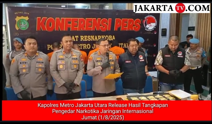 Jakarta, Kapolres Metro Jakarta Utara Kombes Pol Erick Frendriz, S.I.K., M.SI. didampingi Wakapolres Metro Jakarta Utara, AKBP James H. Hutajulu, S.I.K., S.H., M.H., M.I.K., Kasat Narkoba Kompol AKBP Prasetyo Noegroho menggelar jumpa pers terkait penangkapan pengedar narkotika di Mapolres Metro Jakarta Utara, Jumat, (1/8/2025)