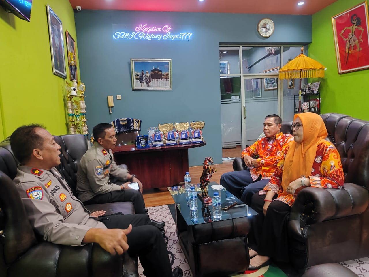 Kasat Binmas Polres Metro Jakarta Utara, Kompol Joko Sutriono, S.H., M.M., bersama Wakasat Binmas, Kompol Widodo, S.Sos., disambut langsung oleh Drs. Indra Bekti dan Ibu Yuliana, S.Pd., selaku perwakilan kesiswaan SMK Walang Jaya.