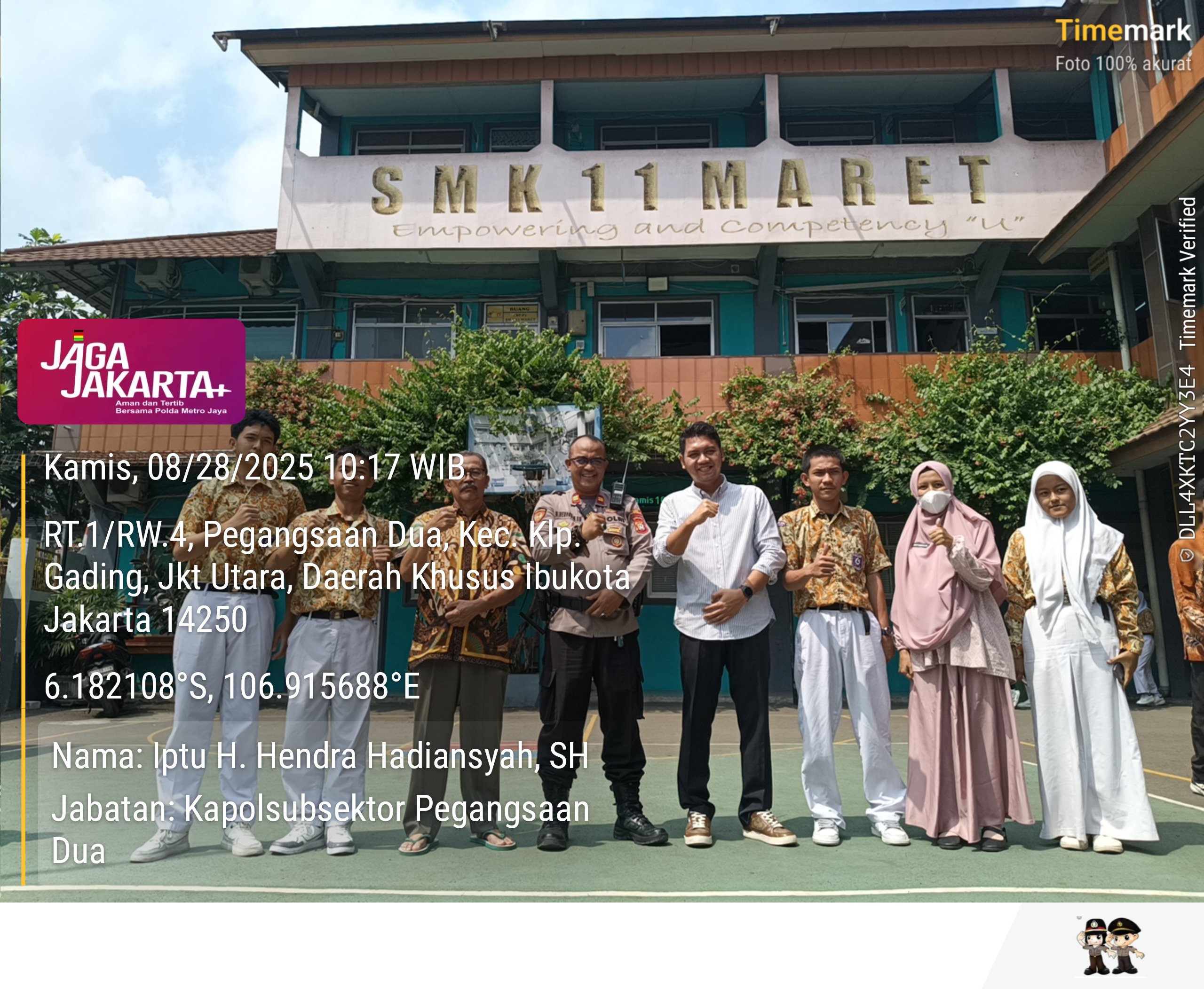 Kegiatan yang berlangsung di SMKN 11 Maret ini dipimpin oleh Kapolsubsektor Pegangsaan Dua, Iptu H. Hendra Hadiansyah, SH, dan disambut langsung oleh Kepala Sekolah Reza Patriotra Putra, S.Kom, serta perwakilan Dinas Pendidikan Provinsi DKI Jakarta, Nur Fisabililah.