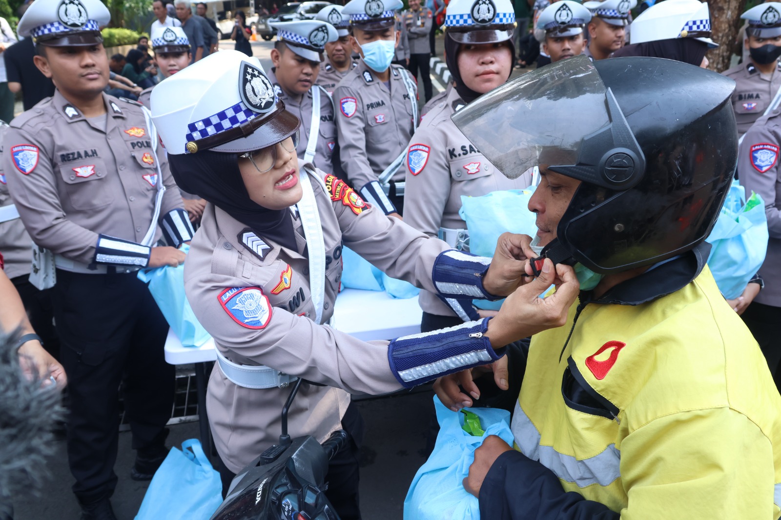 Selain penyerahan sembako, kegiatan Jumat Peduli juga diisi dengan penyampaian imbauan keselamatan berlalu lintas dan pesan kamtibmas kepada para pengemudi Ojol oleh anggota Polwan. Mereka mengingatkan pentingnya menaati aturan lalu lintas, menjaga keselamatan diri dan penumpang, serta ikut membantu menciptakan situasi yang aman di jalan raya.